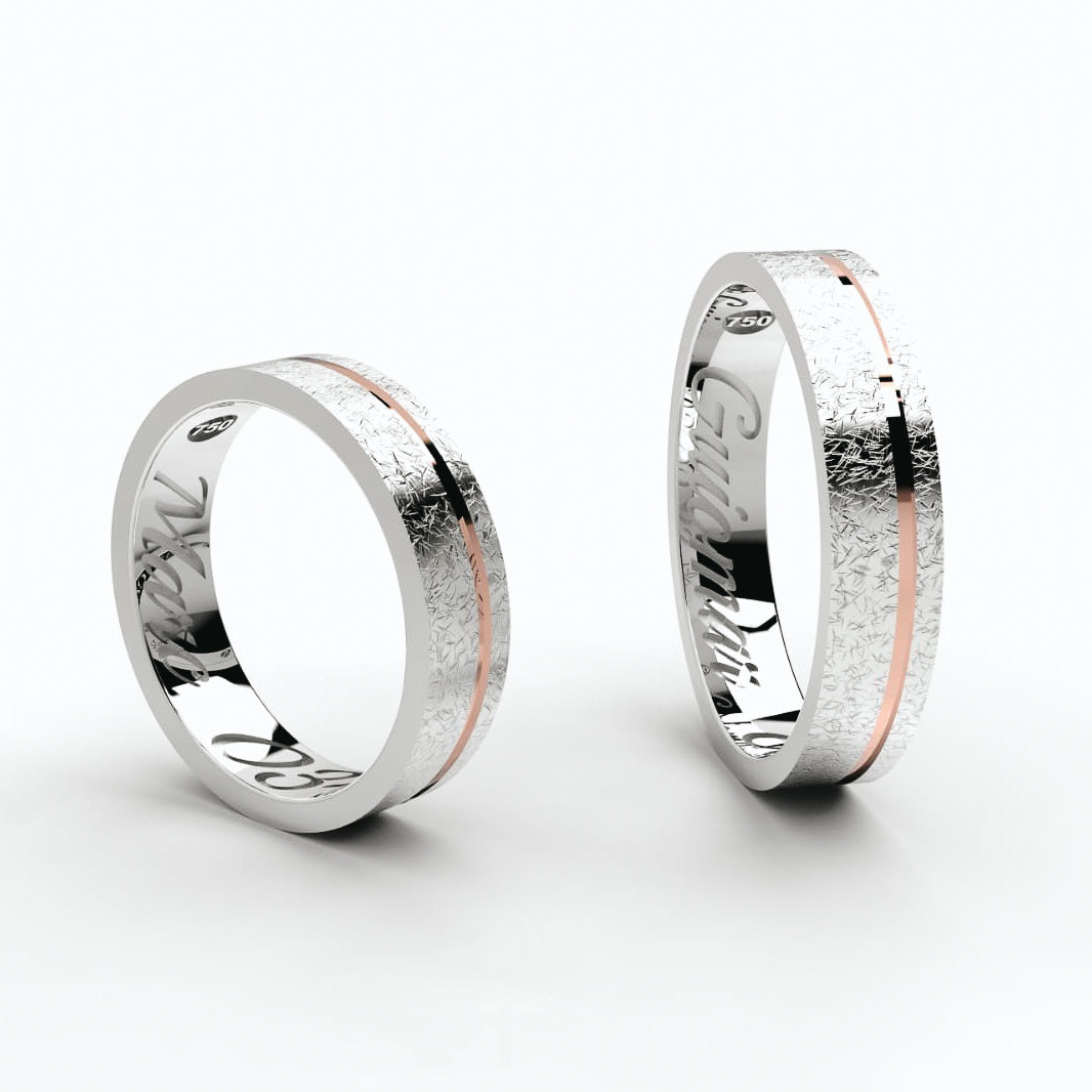 Este modelo de alianza es bicolor. Está formado por un aro ancho y plano de oro blanco con un hilo de oro rosa intercalado. Tiene un ancho de 4,5 mm aproximadamente.