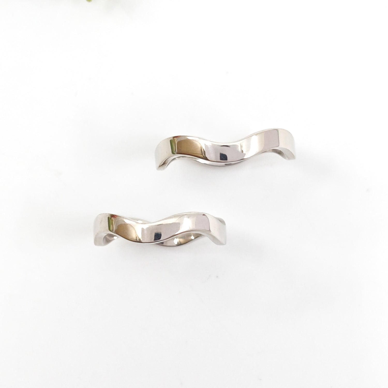 Este modelo de alianza es de oro blanco y tiene forma ondulada. Tiene un ancho de 3 mm aproximadamente.