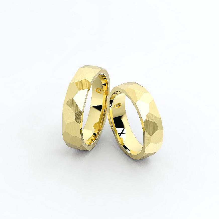 Este modelo de alianza está hecho en oro amarillo y tiene un acabado martelé. La anchura de la alianza es de 5 mm.