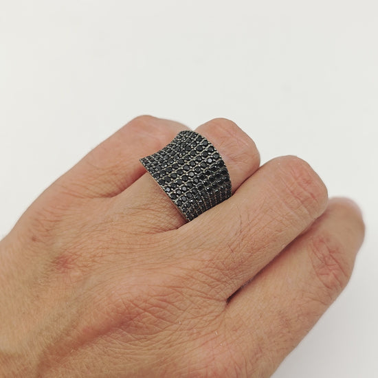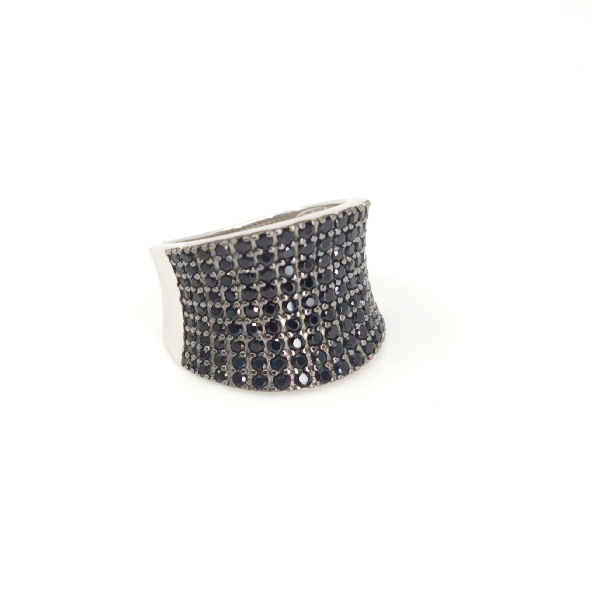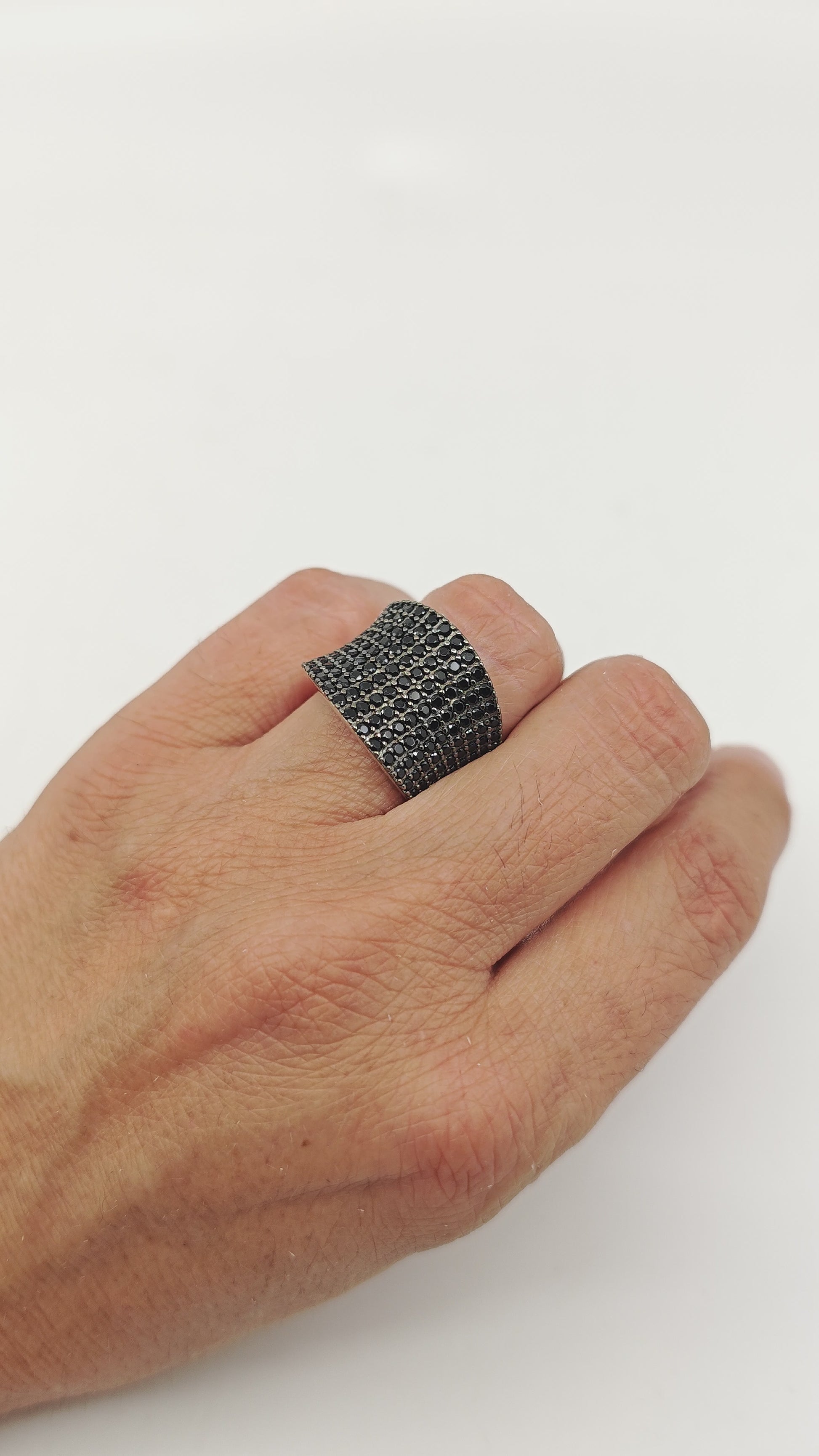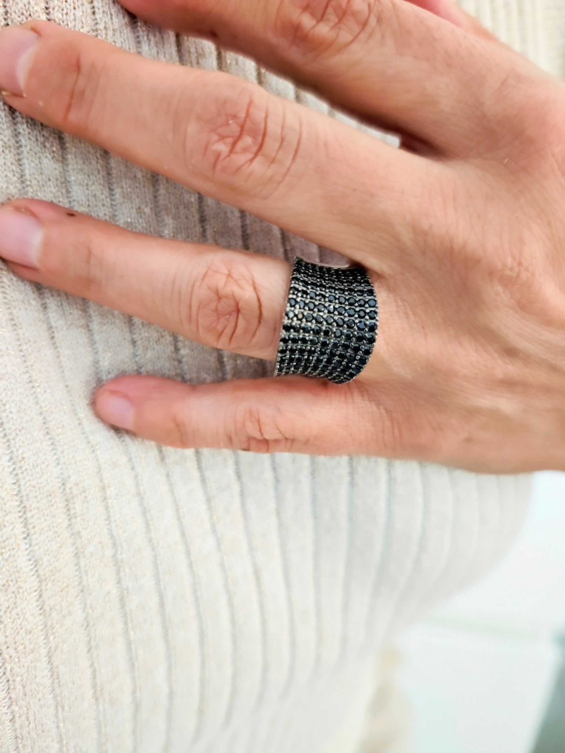 Anillo de plata de ley rodiada, con pavé de circonitas negras. Una pieza con un brillo muy bonito y que dará un contraste y un toque elegante a tus manos.