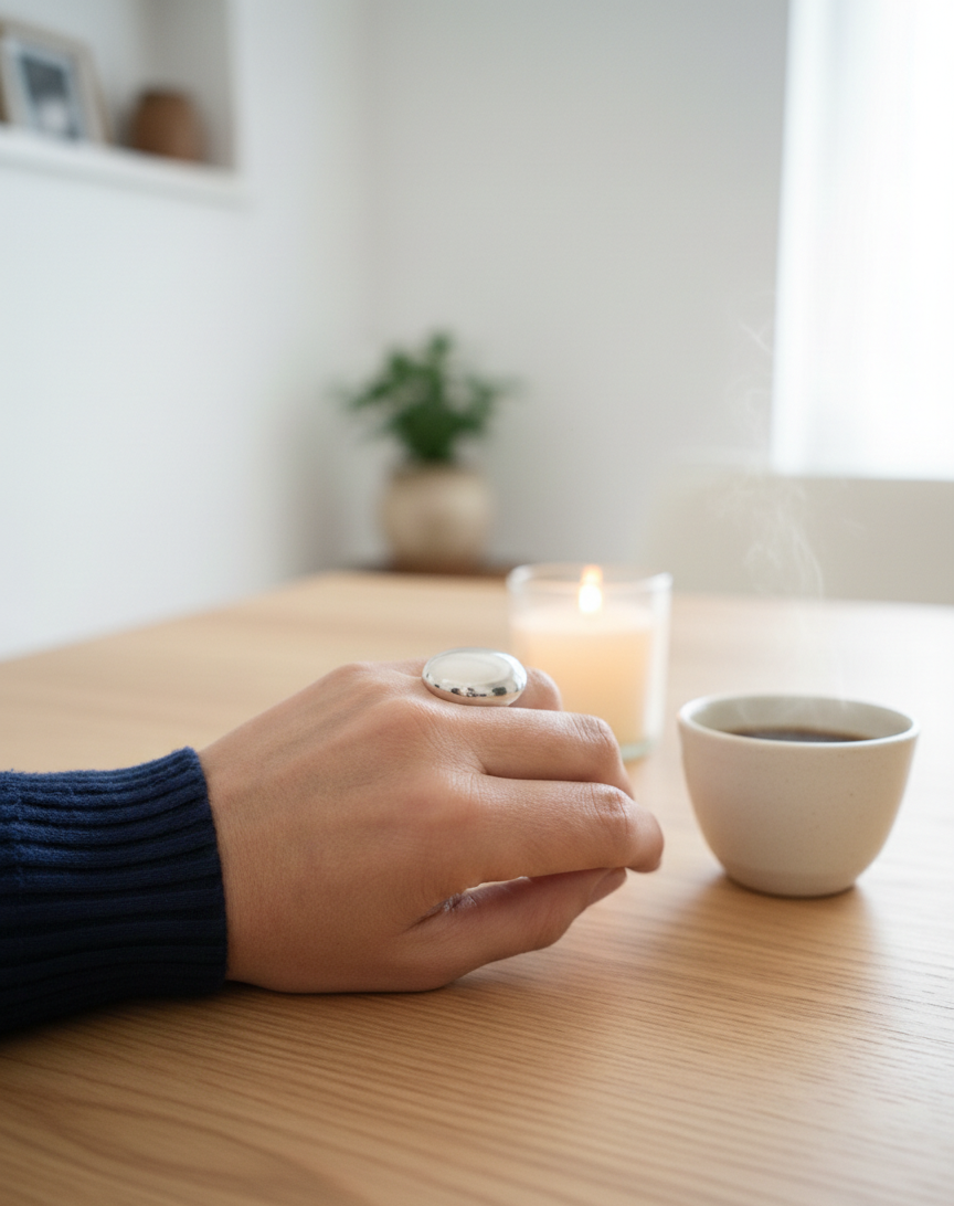 Este anillo destaca por su superficie pulida y su diseño ovalado impecable. Cada reflejo en su plata brillante cuenta una historia de luz y calma, convirtiéndolo en un centro de atención discreto pero inolvidable.