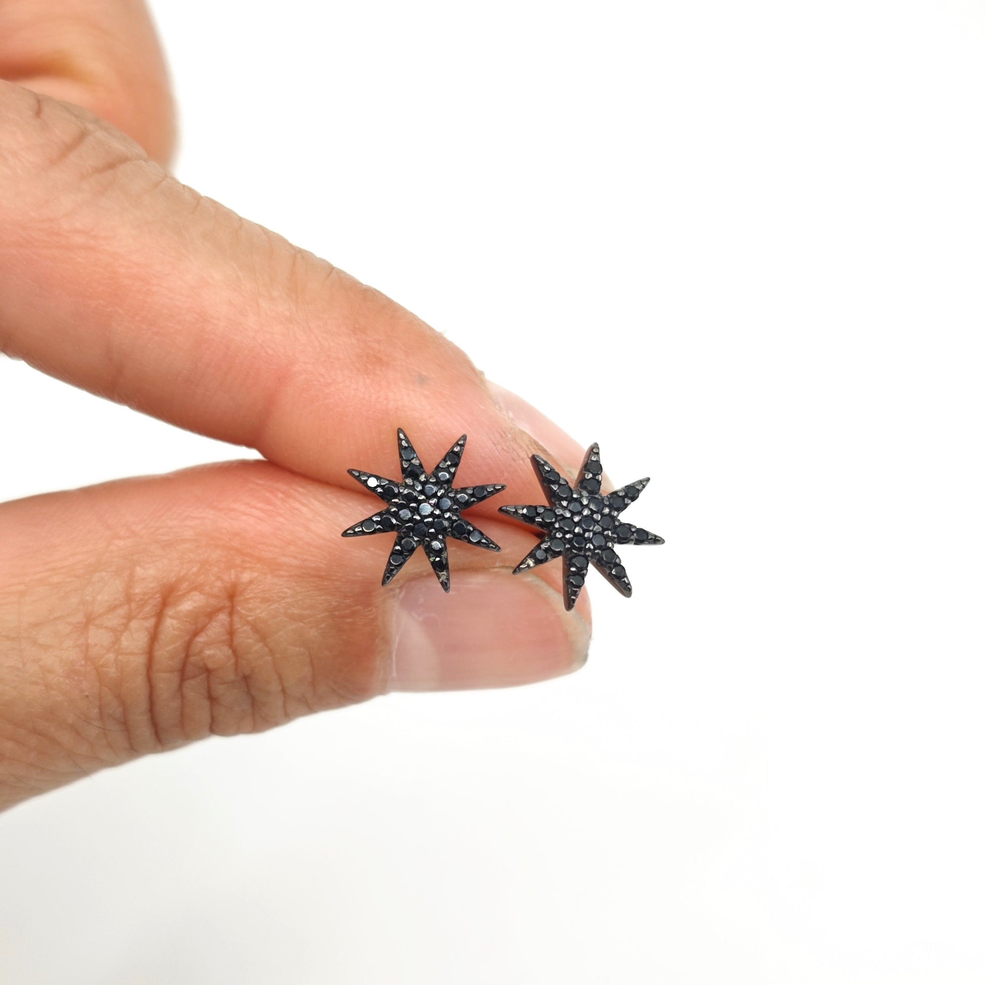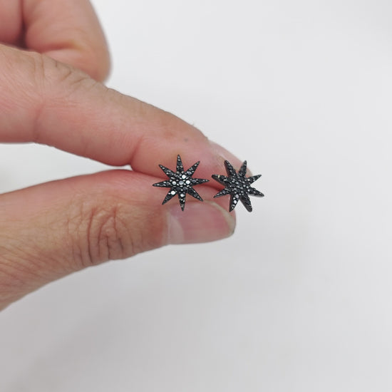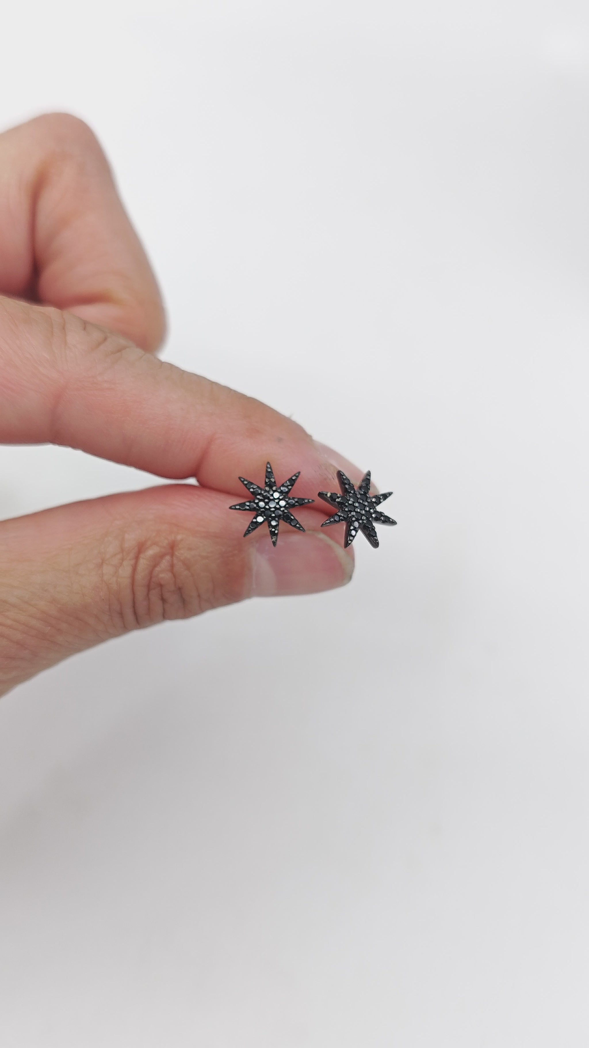 Ilumina tu look con estos pendientes en forma de estrella de ocho puntas, un diseño moderno y sofisticado. Su acabado en tono oscuro con pequeñas circonitas negras aporta un toque elegante y contemporáneo, perfecto para cualquier ocasión.